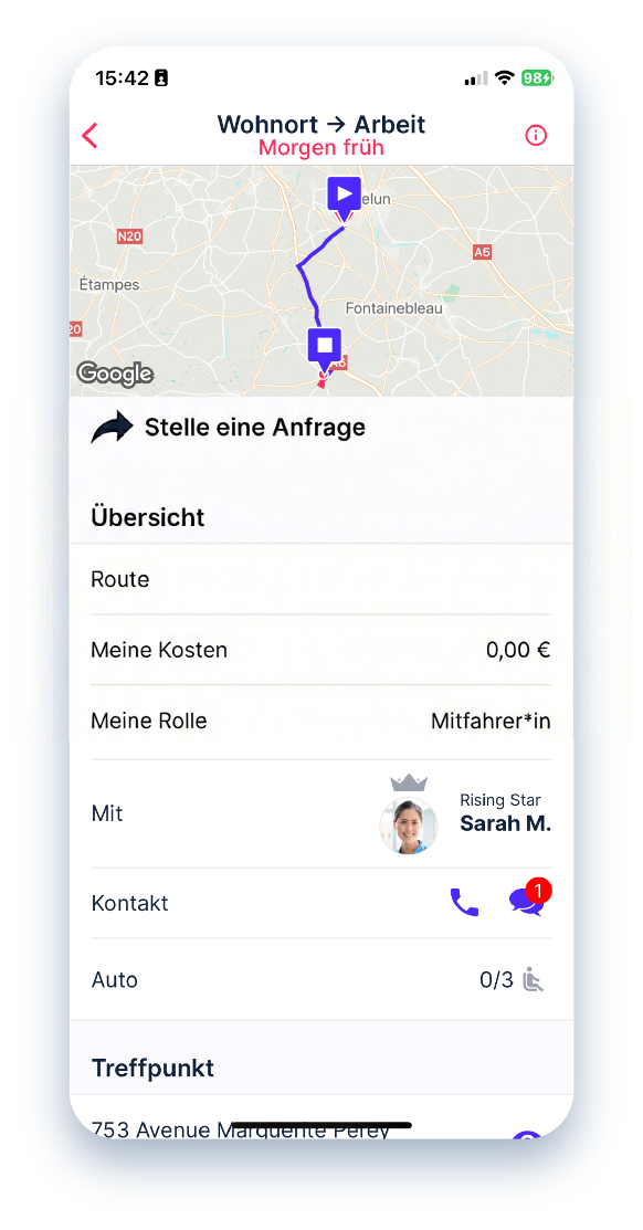 Die App schlägt passende Fahrten vor – basierend auf Strecke, Zeiten, Präferenzen (z. B. bevorzugte Route, nur mit Frauen/Männern fahren, Musik, Kommunikation) und Arbeitgeberzugehörigkeit.