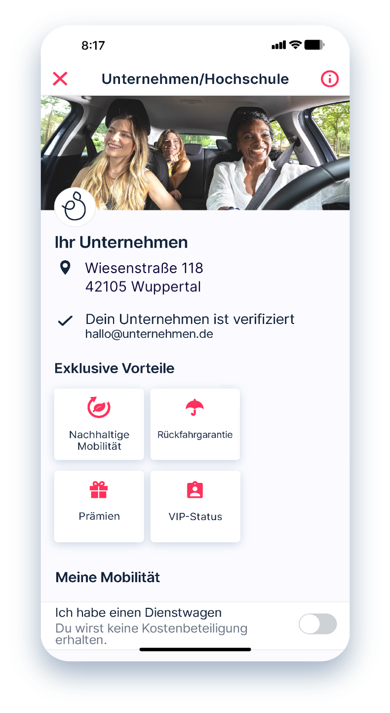 Die App bietet u. a. exklusive Frauen- oder Männerfahrten, verifizierte Profile und einen integrierten Chat. Außerdem können Mitarbeiter:innen von teilnehmenden Arbeitgebern ihren Arbeitgeber angeben, um auch hier Transparenz zu schaffen. Zusätzlich bietet der Anbieter Karos Mobility eine Rückfahrgarantie und übernimmt die Kosten* für die Rückfahrt mit alternativen Verkehrsmitteln.